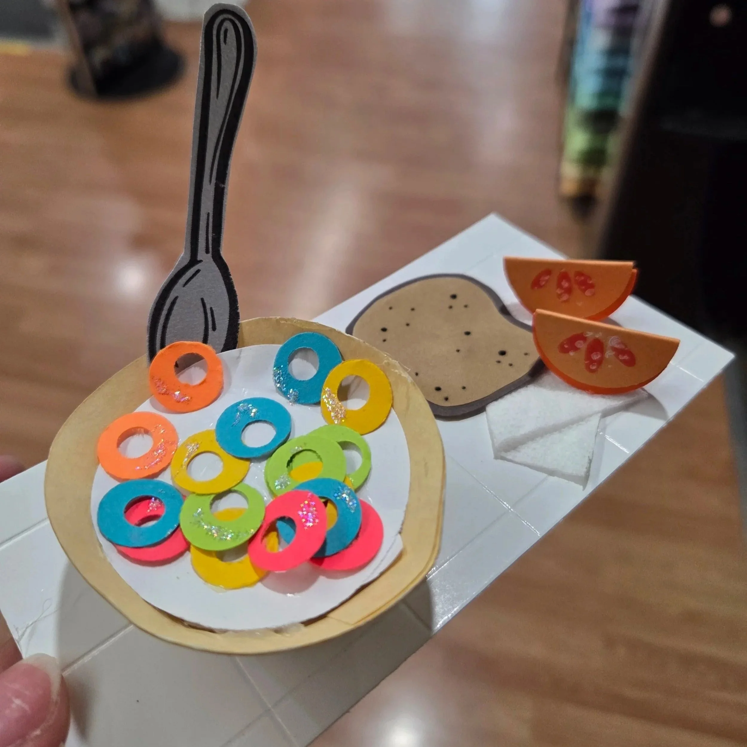 A mini breakfast spread, complete with everything you need to create a bowl of fruity cereal, a spoon, toast, and orange slices on the cutest mini countertop.