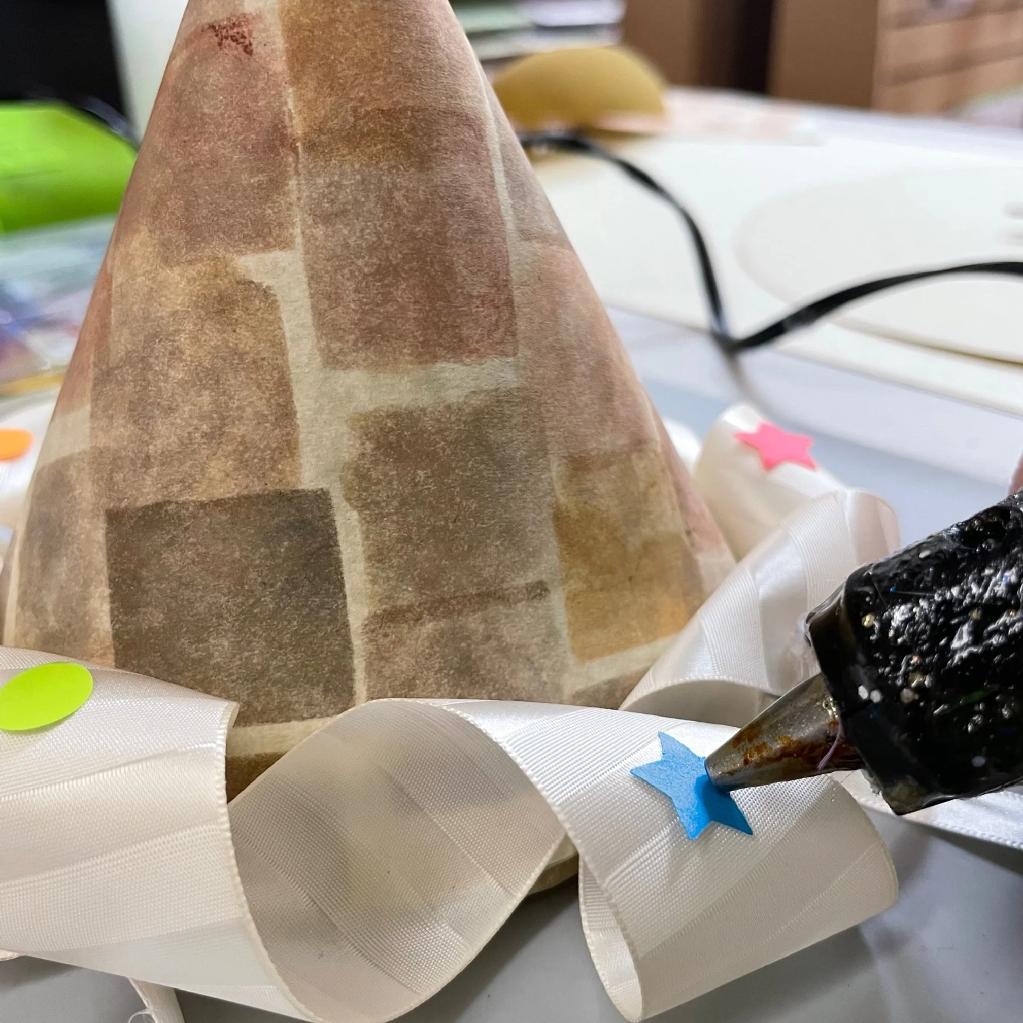 Curl the paper around itself until you have a pointy cone! Adjust the paper until your desired pointiness! Sometimes a wider cone with big ribbon is lovely- or sometimes a thinner cone with thinner ribbon fits perfect!!