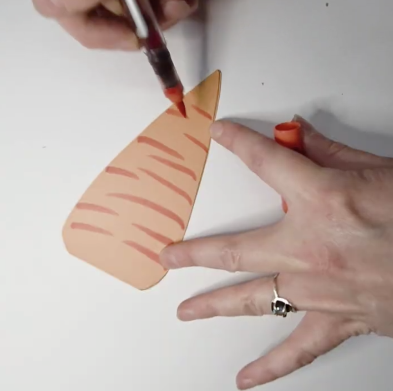 Using the scraps from cutting out the carrot, cut out small triangles. Round the tops slightly to make them feel more carrot-y. Make a few! Tip: if your orange marker doesn’t dry on the orange shimmer paper, only add texture lines to the matte mini carrots.