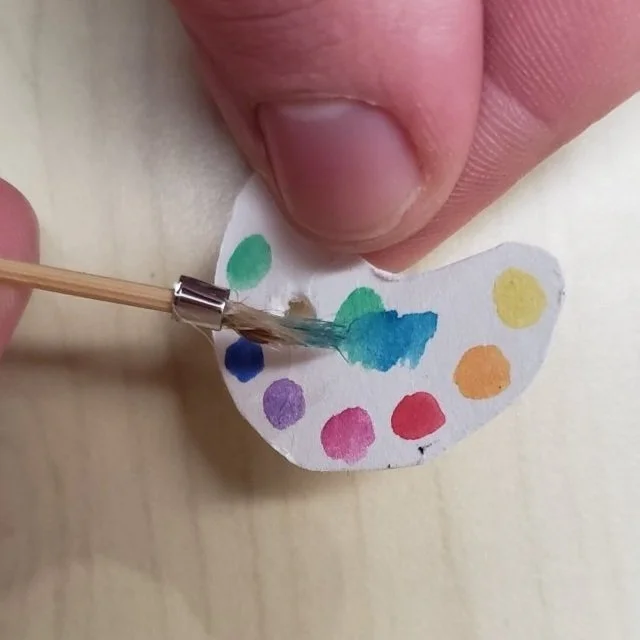 The palette was made by fussy cutting a curved crescent shape, adding a hole in the center, and painting rainbow swatches across the border! It looks just like the real thing!