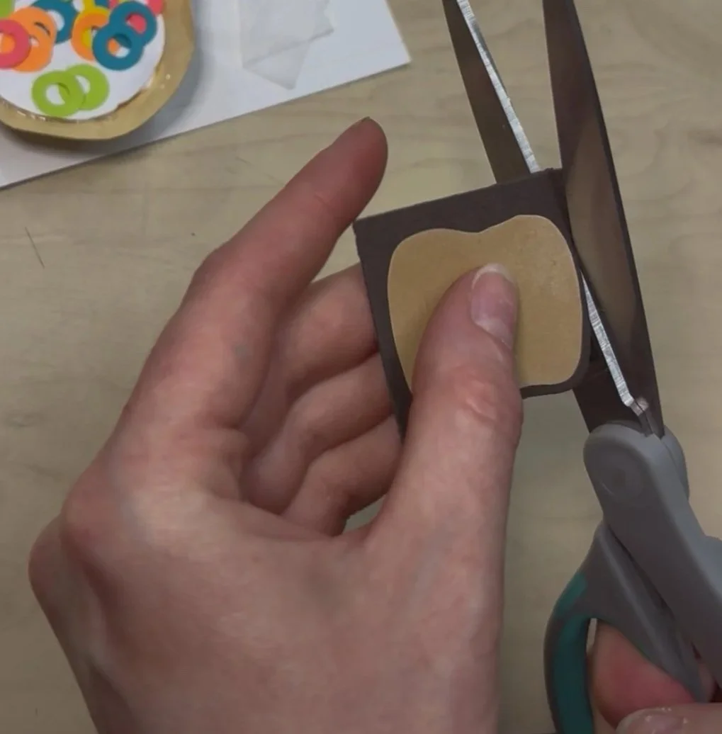 Grab the square of tan suede. Cut it out, using the outline of the toast as a guide. Once it’s cut out, glue it to the brown square of paper. Cut out around the edges of the suede, leaving just enough room for there to be a crust. You can add some cute little speckles to act like toast marks.