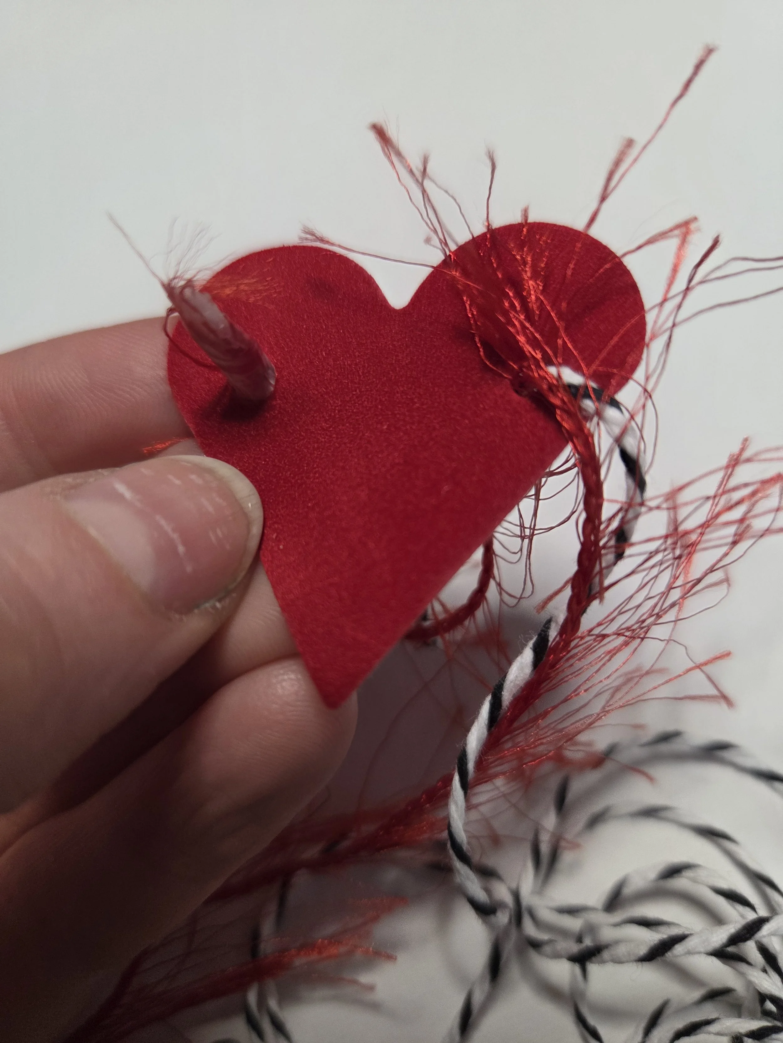 Grab your first heart and start by threading your strings through the front of the heart. If you start with a suede heart, the fuzzy side is the front of the heart.